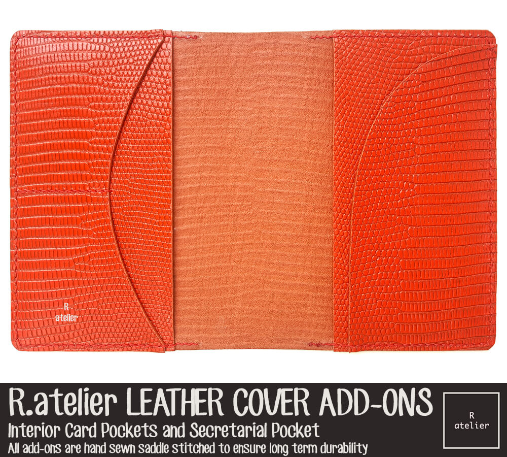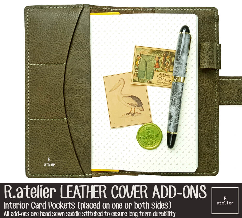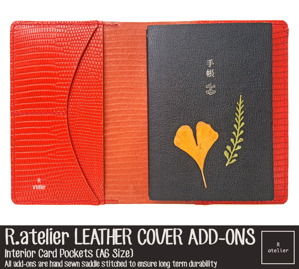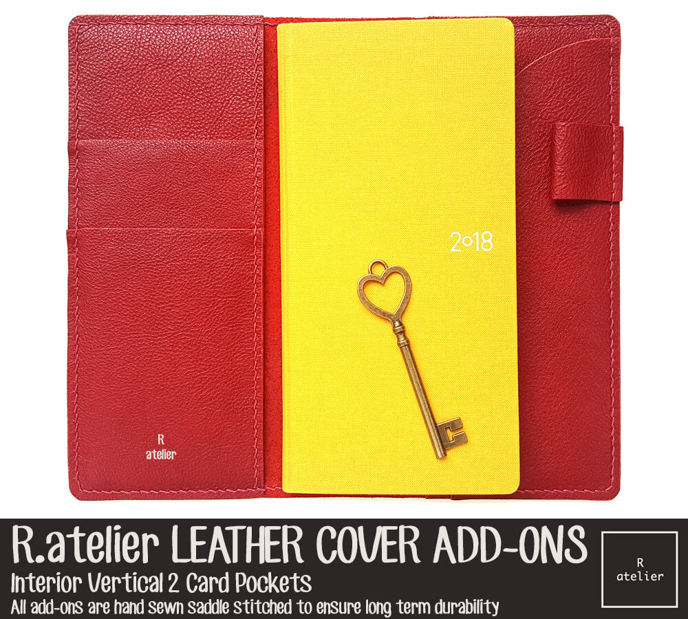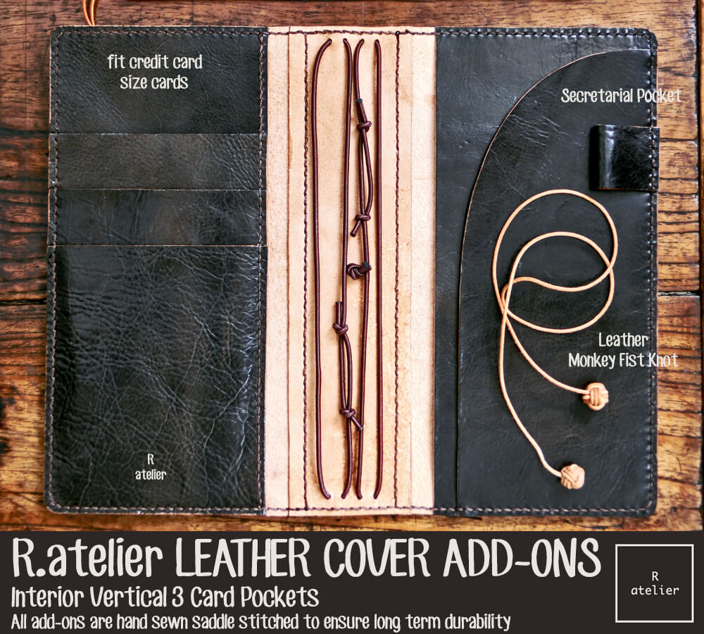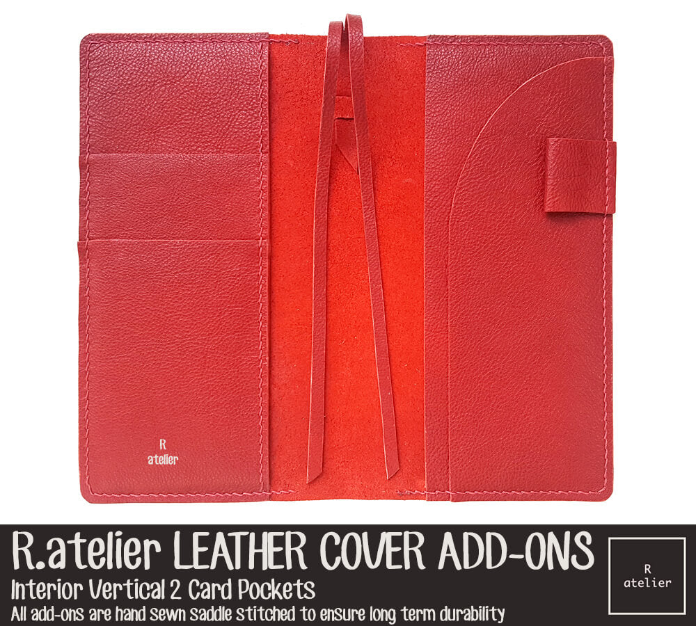 5) Interior Vertical Card Pockets - amount of pockets is relative to size of the leather journal cover. Interior Vertical 3 Card Pockets is not available for Pocket nor Passport Size